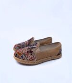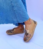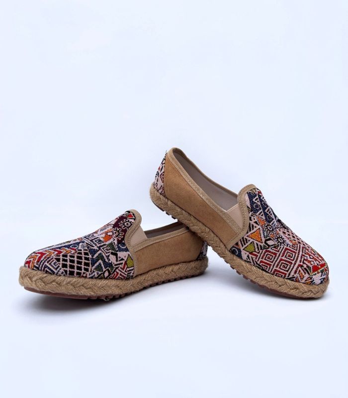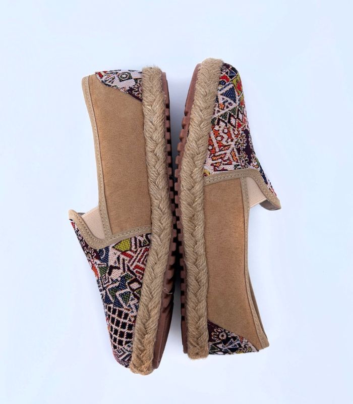 La base textil de estas alpargatas está meticulosamente tejida en un patrón estampado inspirado en la calidez de la tierra y la riqueza de sus tonos. Los matices terrosos de marrones suaves, ocres y tostados se entrelazan de manera armoniosa, creando un diseño que evoca la belleza de la naturaleza.