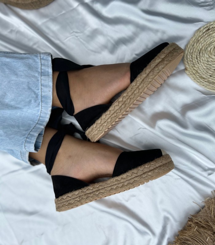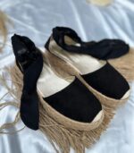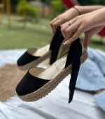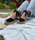 Estas alpargatas negras presentan un elegante diseño con una suela de espanso rodeada de yute natural, que ofrece un toque clásico y cómodo.